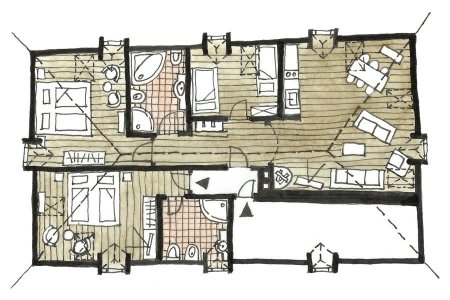 2 bagni con WC, bidet, asciugacapelli, doccia, un bagno dei quali con vasca da bagno, 2 camere da letto doppie, 1 camera con due letti, grande soggiorno con comodo divano letto e camino, cucina con tavolo da pranzo per 8 persone,lavastoviglie, Sat TV.